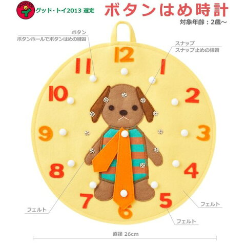 デジタル時計は多いけど、アナログ時計の読み方がわからない…洋服のボタンかけがうまくできない…お子さまとママで「今、何時かな?」「長い針と短い針がこのかたちになったらご飯にしようね」など楽しく会話しながら使ってみてください。